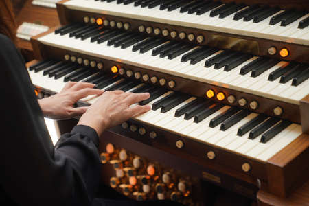 male hands playing organ keyboard in church