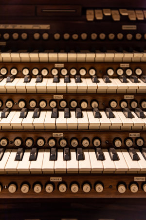 Close up of ancient pipe organ keyboards in european cathedral