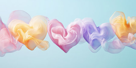 An abstract design of swirling heart-shaped flower petals in soft shades of pink, lavender, and yellow, floating on a light blue background.
