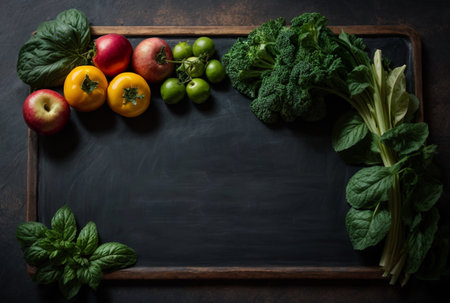 Vegan food and dishes on black chalkboard background. Space for text. Generative AI.