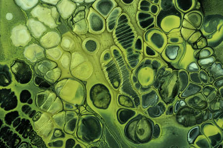Fluid Art. Abstraction from green paint bubbles with inclusion of gold. Marble effect background or texture