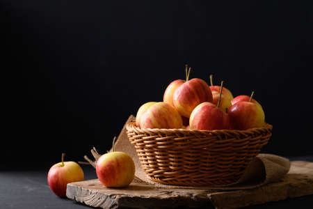 Fresh red apple fruit in a basket on wooden with black background, Still Life