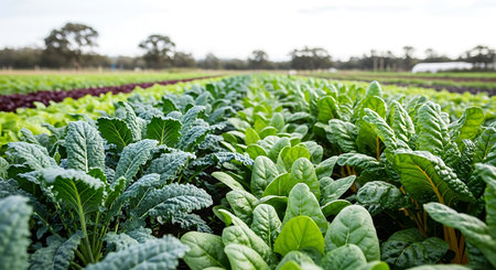 A Lush green organic farm with rows of fresh vegetables under warm sunlight