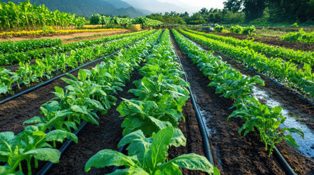 Rows of vibrant green vegetables thrive in rich soil under bright sunlight. Surrounding greenery adds to the serene atmosphere of this flourishing farm.