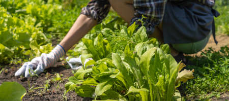 Organic vegetables. Farmer hand picking fresh butterhead lettuce, and salad in the farm. freshly collected in an organic orchard. Freshly harvested vegetables. selected focus