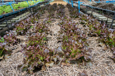 Rows of fresh organic red oak lettuce salad plant in Growing Organic vegetable farms.-selective focus