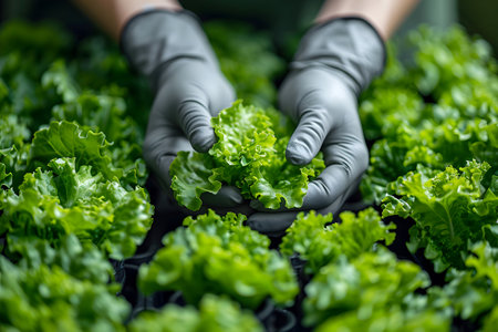 Gardener's hands in gloves holding fresh green lettuce leaves in a garden. Aeroponic growing.