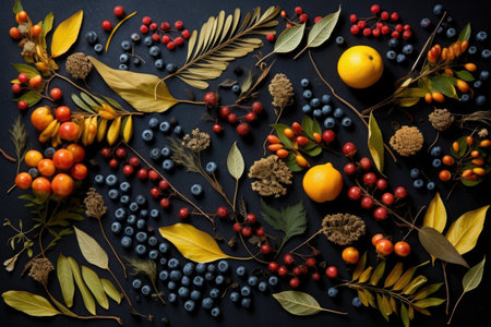 creative flat lay of leaves, berries, and twigs, created with generative ai