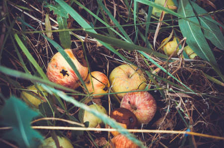 Rotten apples with mold. The apples on the ground are spoiled. Close-up