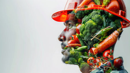 Construction worker with safety gear, double exposure with a nutritionist vegetable arrangement, focusing on healthy habits.