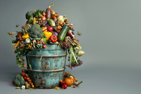 Generative AI, food waste compost in old metal basket, environmental background, kitchen waste