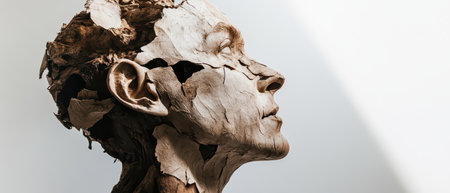 A striking sculpture representing a human profile intricately designed with bark and wood textures illuminated by soft light.