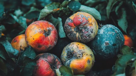 Rotten fruits and vegetables in a pile, with signs of decay, spoilage, and mold, highlighting food waste on a farm or market