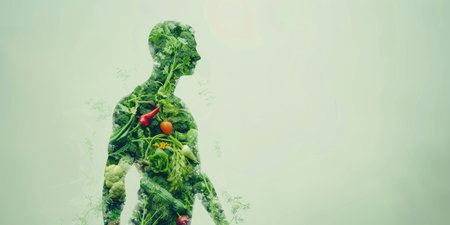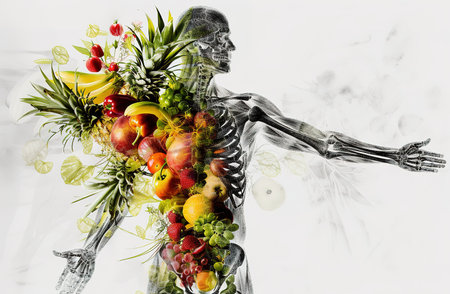A striking conceptual illustration of a human silhouette filled with vibrant fruits and vegetables, symbolizing health and vitality in a creative, artistic way.