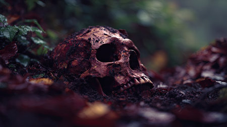 A skull rests amongst leaves and foliage, presented with a shallow depth of field. The skull has a dark, weathered appearance. The image uses rich colors and dramatic lighting to create a sense of mystery. It would be suitable for various editorial or commercial purposes, such as illustrations or educational resources.