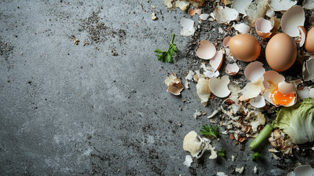 A mix of composting materials including eggshells, vegetable waste, and organic matter, placed on a gray surface, perfect for sustainable composting and gardening.