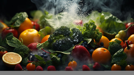Fresh fruits and vegetables with smoke on black background. Healthy food concept.