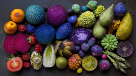 Vibrant array of exotic fruits and vegetables displayed on dark surface.
