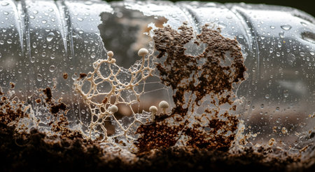 A fascinating macro view shows a delicate mycelium network and tiny white mushrooms growing on soil inside a discarded, broken plastic bottle covered in condensation. The image illustrates nature's process of decomposition and life's ability to thrive even amidst human waste. It's a powerful statement on ecology, pollution, and the life cycle.