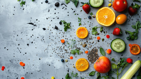 A captivating display of fresh fruits and vegetables, showcasing vibrant colors and textures against a rustic gray background. Ideal for healthy living.