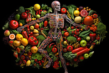 Vibrant illustration of human anatomy surrounded by a variety of fresh colorful fruits and vegetables, emphasizing healthy eating