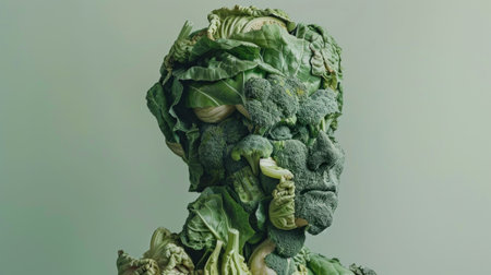 Human figure made of green vegetables with a serene expression against a light green background