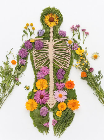 Artistic representation of a human form made of flowers and greenery, symbolizing health, wellness, and connection with nature, featuring vibrant colors and seasonal elements