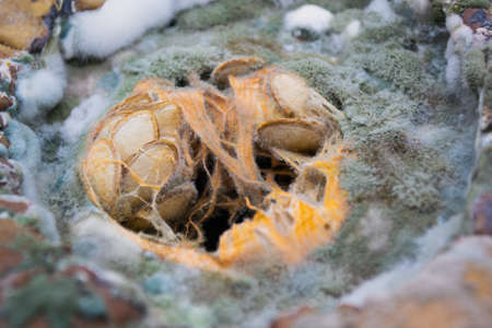 Close-up of green, blue and white mold growing on a rotten pumpkin with seeds in the middle.