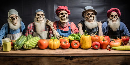 skeletons in work clothes sitting at the table with vegetables. Halloween concept.