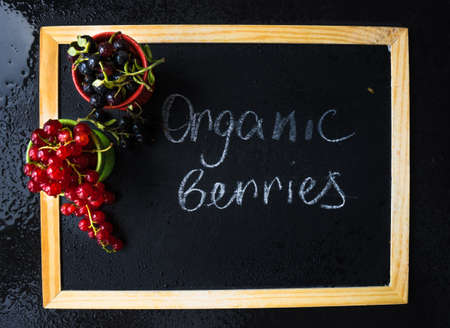 Ripe organic currant berries on dark wooden table with copyspace as a organic food concept