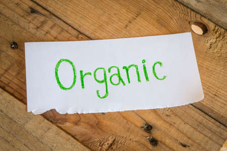 organic text on a paper price tag with a twine against textured green bark paper