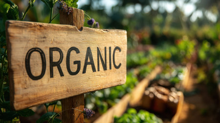 A rustic wooden sign displaying Organic amidst a flourishing garden brimming with vibrant greens and fresh vegetables at dawn.