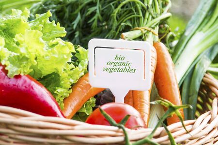 Bio organic vegetables basket with label, fresh local food concept