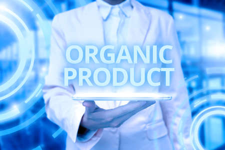 Conceptual display Organic Product. Business concept made from materials produced by organic agriculture Lady Uniform Standing Tablet Hand Presenting Virtual Modern Technology