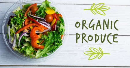Overhead view of organic produce symbol by fresh salad in bowl on wooden table. digital composite of healthy food and sign.