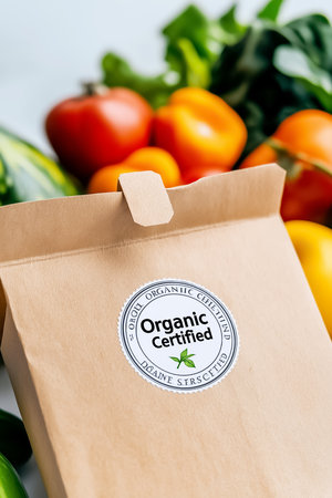 An Organic Certified stamp is applied to eco-friendly packaging, highlighting commitment to quality. Fresh and colorful produce creates a vibrant backdrop, representing healthy choices.