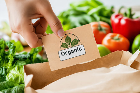 A hand applies an organic certified stamp to eco-friendly packaging, highlighting the freshness of nearby vibrant vegetables, embodying a commitment to quality and sustainability.
