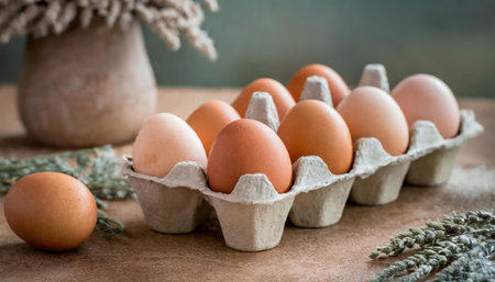 A visually appealing assortment of fresh farm eggs arranged in a rustic carton, showcasing their varied textures and colors, ideal for culinary visuals.