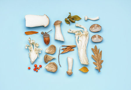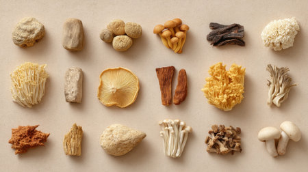 An aesthetically arranged display of various edible mushrooms and fungi on a neutral surface, ideal for culinary projects, nutrition research, and food photography.
