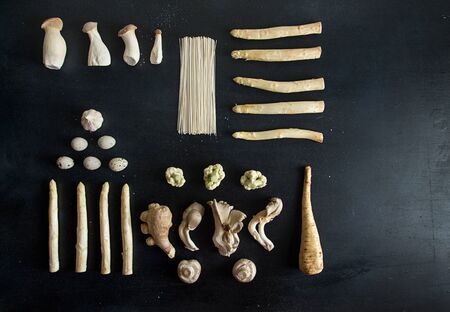 Plant based modern still life flat lay. Raw ingredients set for cooking on black background: white asparagus, mushrooms oyster, cauliflower, noodles, garlic, eggs and ginger on black background. Overhead. Top view.Copy space.