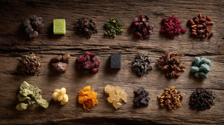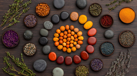 A top-down view of an array of dried plant materials and seeds arranged aesthetically. Perfect for illustrating natural ingredients and healthy lifestyle themes.
