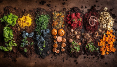 creative flat lay of herbs forming a spiral pattern, created with generative ai