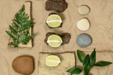 Creative layout of geometry from nature of materials, craft paper, wood, stone with fern leaves. Flat lay. A place for any products.