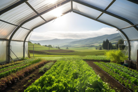 greenhouse with view of rolling hills and farmland, created with generative ai