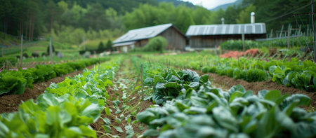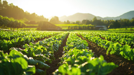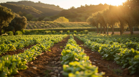 A Lush green organic farm with rows of fresh vegetables under warm sunlight