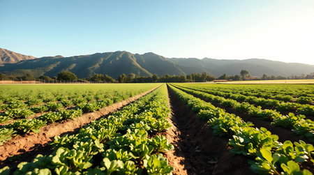 Breathtaking view of vegetable rows extending to distant mountains. Perfect for illustrating agriculture, healthy eating, and the beauty of sustainable farming.
