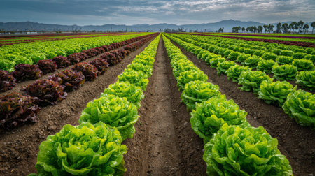 A breathtaking view of verdant lettuce fields stretching into the distance, showcasing the beauty of agriculture amidst a dramatic sky backdrop.