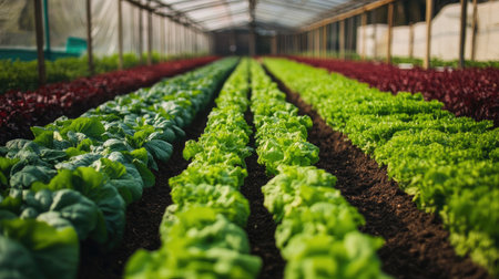 Lush green lettuce plants thrive in a spacious agricultural greenhouse under a vibrant blue sky, showcasing the beauty of sustainable farming practices.