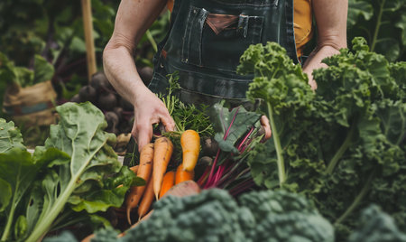 An AI generated illustration of a farmer harvesting freshly grown organic green vegetables in a farm