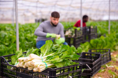 Farmer and his assistant harvesting ripe mangold in greenhouse